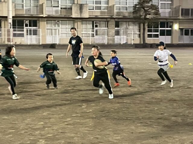 今回は、動きを組み合わせたパス練習や、プレー中の声かけをテーマに取り組み、その後はタグフットボールの試合へ。